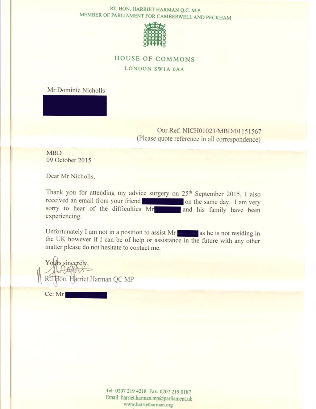 What do the words asylum seeker mean to you? In the current climate it is a politically loaded term; a conflation of economic migrant and refugee. The crisis facing Europe today is at once easy to understand yet impossible to meaningfully comprehend, let alone solve. The phrase has been purloined by those less interested in the plight of the individuals than for the political capital to be made from a good bout of tub-thumping demonisation. But how serious do you think our mainstream politicians are in debating the issues and trying to do the right thing? My confidence has been shaken by the letter I received (pictured above) from Harriet Harman MP, my member of parliament, over a case I took to her regarding a friend of mine in Yemen, in similarly deep trouble to those fleeing Syria.