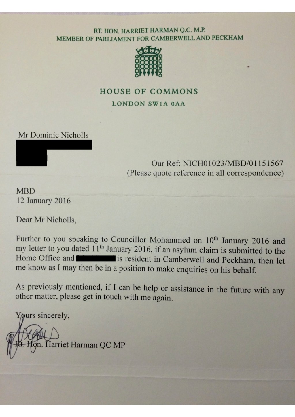 I received the two replies above. Neither addressed my central question about requesting the Foreign Office to approve a visa for Adim and his family. I can only conclude Ms Harman has unfortunately missed the point once again. Still, as she says, I’ll try not to hesitate before contacting her in the future for any more help.