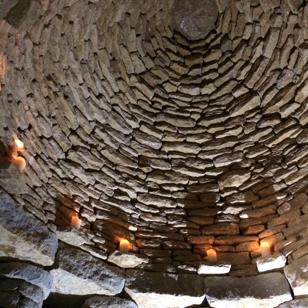 Stepping inside the transformation is immediate. A few paces and the world outside is another place. Sound reduces to a low, comforting hum as the wind channels through the barrow. Voices do not carry and are instead softened by the floor and stone walls varying in hue from grey to blue depending how deep in the mine they had lain (the higher the pressure, the more a stone exhibits a blue colour). The 11-metre wide structure consists of an inner chamber of 59 large ‘family’ niches surrounded by an outer circle of 349 smaller spaces. Both the inner and outer sections have corbelled roofs five meters high. The stones are supported by their collaborative weight, with a modest use of lime mortar throughout. York stone benches lining the outer circle and inner chamber offer a place for contemplation, laughter, grieving; whatever the family want, and whatever offers them a “simple, easy and uncluttered death”. Prehistoric barrows harnessed the excitement and energy of a communal human gathering as our forebears celebrated where we came from, as well as where we were going. The ceremony, as the central unifying event, connected the living to the dead. It still can.